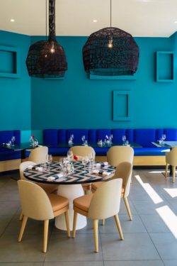 Corinne Sainrat, la directrice vous accueille dans une salle au style « arty », colorée dans un camaïeu de bleu, de bois et de rayures graphiques.
