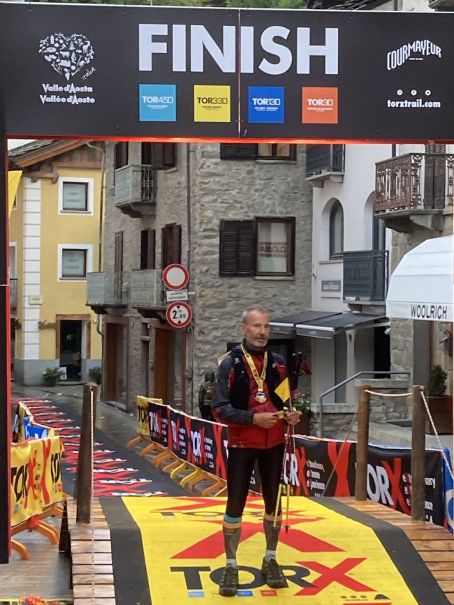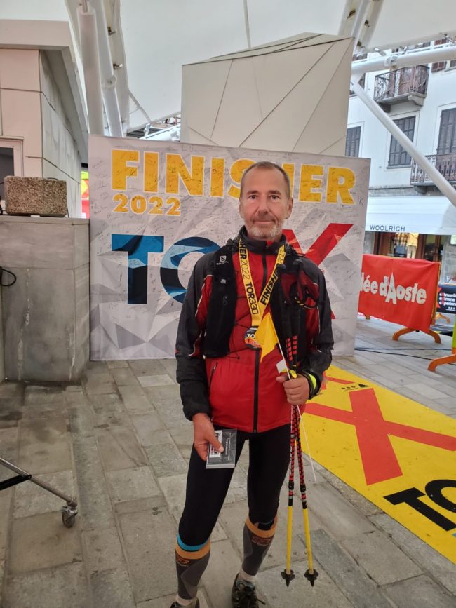 En 2021, je m’étais versé une casserole d’eau bouillante sur la jambe droite la veille du départ. La brûlure au deuxième degré qui en avait résulté m’avait handicapé physiquement sur tout le parcours que j’avais dû réaliser en boitant. En même temps cet événement avait été un électrochoc mental : hors de question de ne pas terminer la course à cause de cette bêtise ! J’avais trouvé l’épreuve très éprouvante et ma première phrase à l’attention de ma compagne à l’arrivée avait été : « Rappelle-moi bien de ne plus jamais m’inscrire à ce format de course ! ». Mais quelques semaines plus tard cette phrase était oubliée. Le Tor 2022 s’imposait…il fallait que je refasse la course dans de bonnes conditions physiques pour mieux profiter de cette course mythique. Malheureusement l’entraînement a été émaillé de quelques blessures et j’ai dû les écourter plus rapidement que prévu début août après avoir déclenché une aponévrosite sous mon pied gauche. J’avais également quelques inquiétudes pour mon genou droit qui craquait à chaque mouvement bien que ce phénomène ne soit aucunement douloureux contrairement à mes douleurs plantaires. Bref j’étais motivé mais la confiance n’était pas très élevée » .