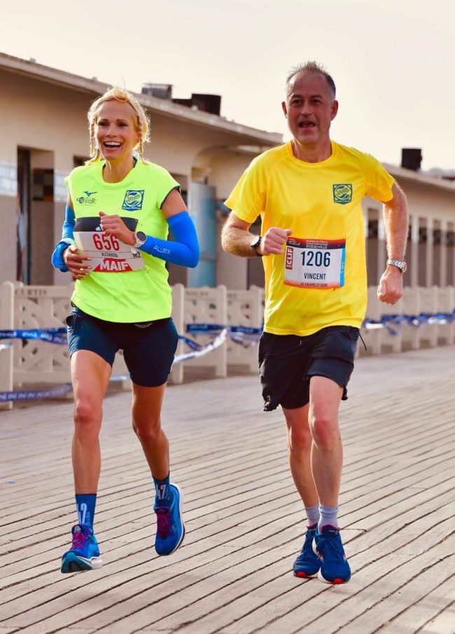 » Je m’entraine à la course à pied 4 à 5 fois par semaine (soit environ 7 à 8 heures ), souvent en binôme avec Alexandra Cholton avec comme objectif commun de faire les 6 World Marathon Majors et une envie de performance du record personnel.