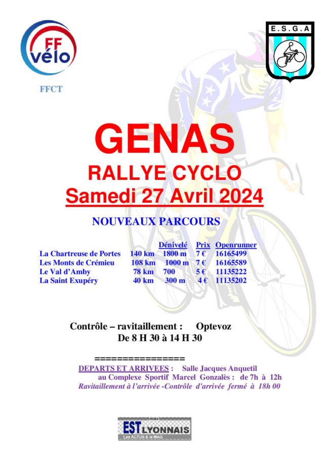 - 7 h à 12 h : Randonnées de Genas / ESGA cyclo : (Départ salle Paul Pervangher).